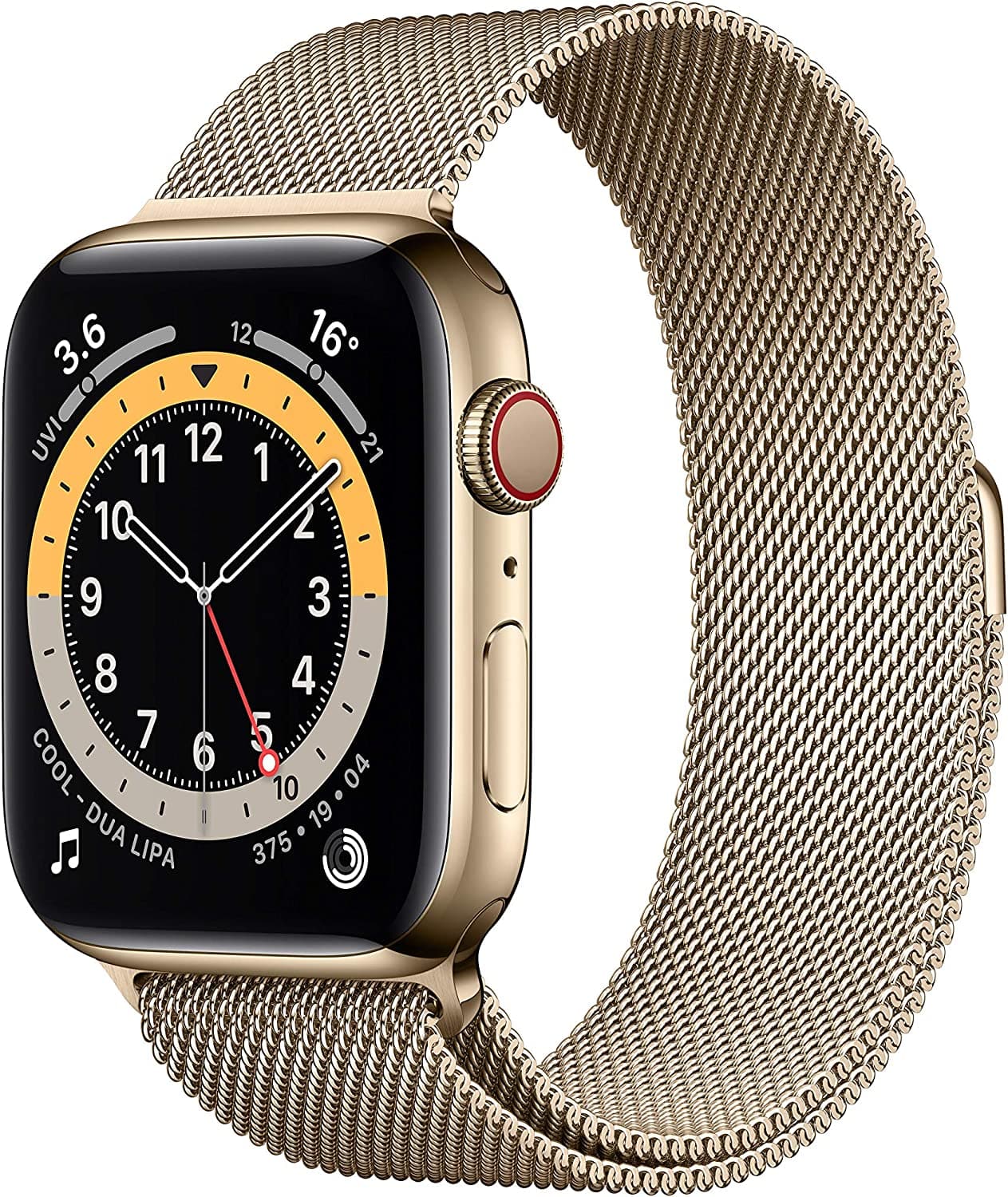 The Apple Watch Series 6 GPS + Cellular in 44mm with a Gold Stainless Steel Case and Gold Milanese Loop is a premium smartwatch that combines elegant design with advanced features and functionality.